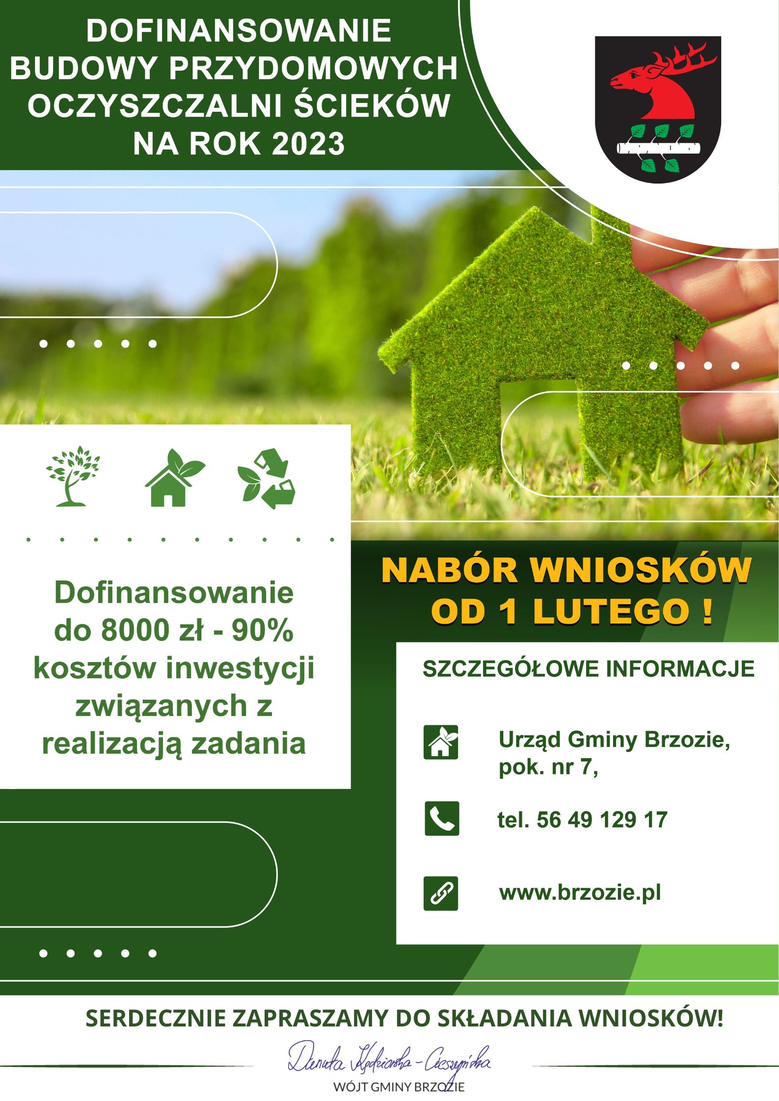 Urząd Gminy Brzozie z dniem 1 lutego 2023 r. ogłasza nabór wniosków o udzielenie dotacji celowej na pokrycie kosztów inwestycji służących ochronie środowiska, polegających na budowie przydomowych oczyszczalni ścieków na terenie Gminy Brzozie na zasadach określonych w Uchwale Nr XXX/214/2022 Rady Gminy Brzozie z dnia 31 maja 2022 r. zmieniająca uchwałę Nr XXI/145/2021 Rady Gminy Brzozie z dnia 10 marca 2021 r. w sprawie określenia zasad, trybu udzielania i sposobu rozliczania dotacji celowej osobom fizycznym i wspólnotom mieszkaniowym na dofinansowanie realizacji przydomowych oczyszczalni ścieków z budżetu Gminy Brzozie.