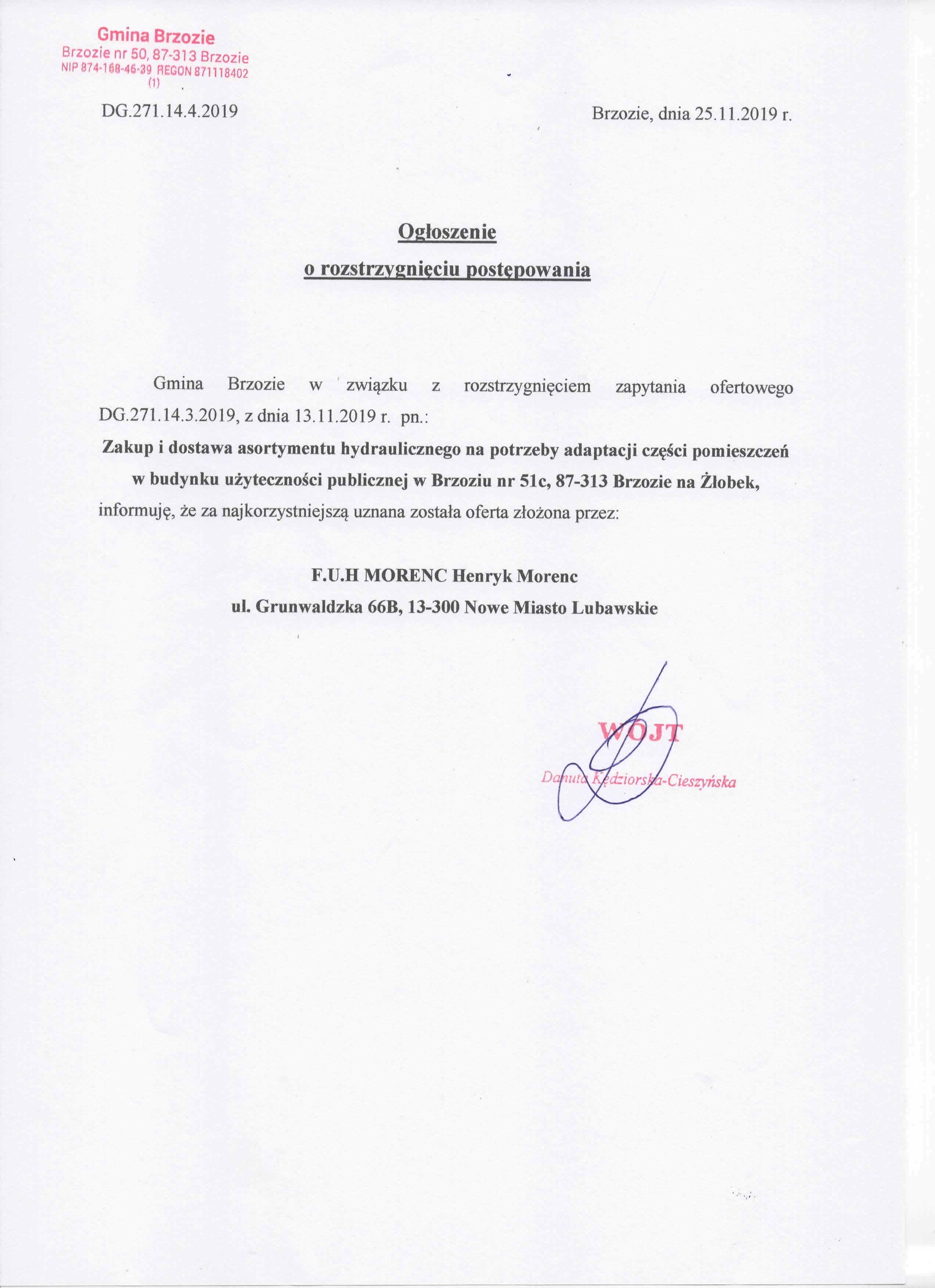 ZAPYTANIE OFERTOWE z dnia 13.11.2019 r. na zadanie pn. : Zakup i dostawa asortymentu hydraulicznego na potrzeby adaptacji części pomieszczeń w budynku użyteczności publicznej w Brzoziu nr 51c, 87-313 Brzozie na Żłobek DG.271.14.3.2019