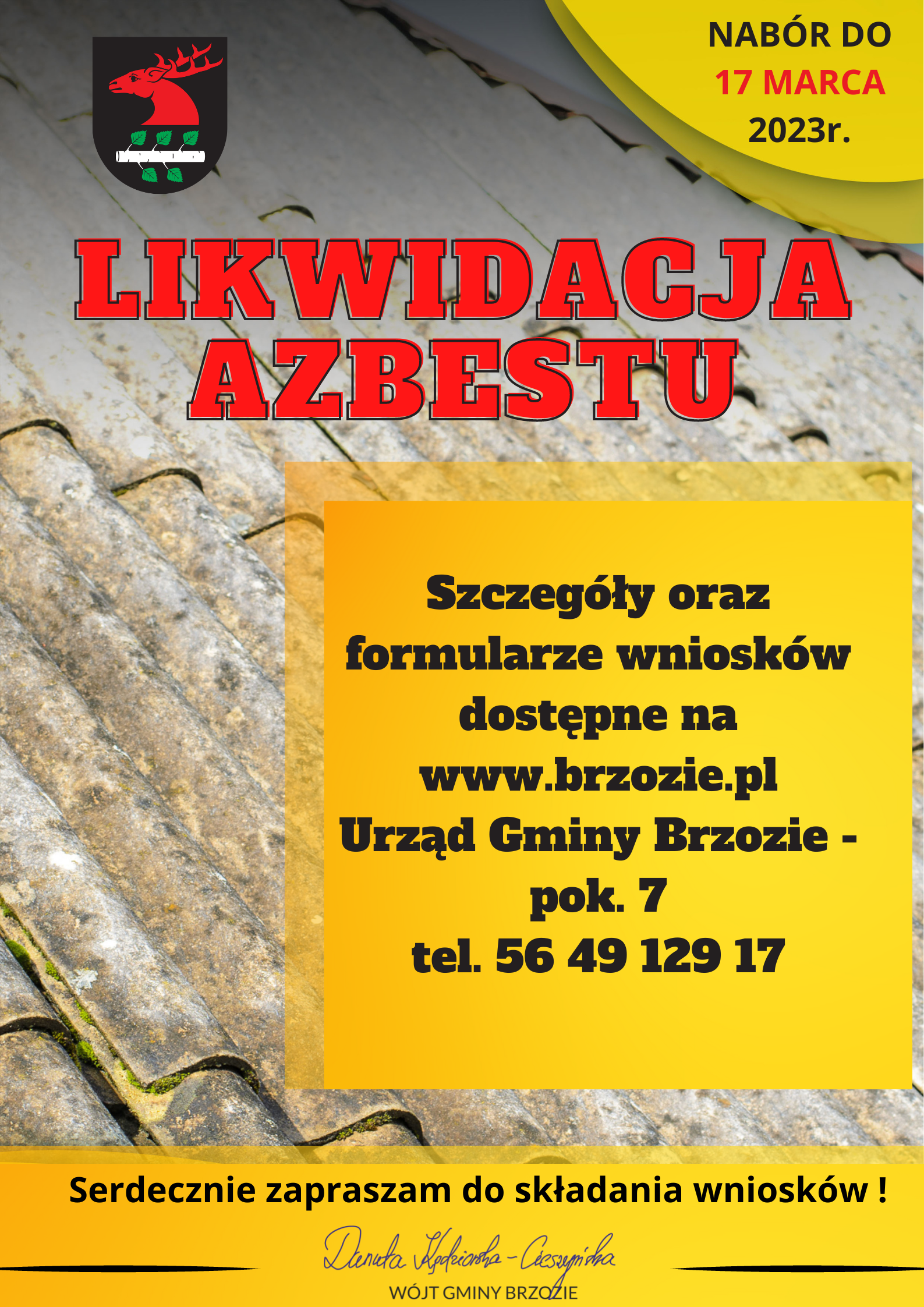Wójt Gminy Brzozie realizując założenia „Programu usuwania wyrobów zawierających azbest dla Gminy Brzozie na lata 2013-2032” ogłasza nabór wniosków na usunięcie wyrobów zawierających azbest w 2023 roku.